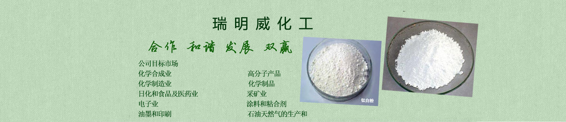 天津市瑞明威化工有限公司公司概況公司本著“興業(yè)、興人、興社會(huì)”的三興企業(yè)文化在業(yè)內(nèi)有著崇高的聲譽(yù)產(chǎn)品覆蓋面大,銷(xiāo)售輻射華東、華南、華北數(shù)百種產(chǎn)品,多種銷(xiāo)售模式可供選擇華東、華北、沿海、沿江長(zhǎng)期包租有儲(chǔ)罐和倉(cāng)庫(kù)提供個(gè)性化的完全服務(wù),解決用戶(hù)在化學(xué)品使用中的一切煩惱供應(yīng)鏈外包 個(gè)性化定裝與標(biāo)簽 來(lái)料加工業(yè)務(wù) 分包裝 化工超市 買(mǎi)方庫(kù)存管理公司目標(biāo)市場(chǎng)化學(xué)合成業(yè) 高分子產(chǎn)品化學(xué)制造業(yè) 化學(xué)制品日化和食品及藥業(yè) 采礦業(yè)電子業(yè) 涂料和粘合劑油墨和印刷 石油天然的生產(chǎn)和提煉